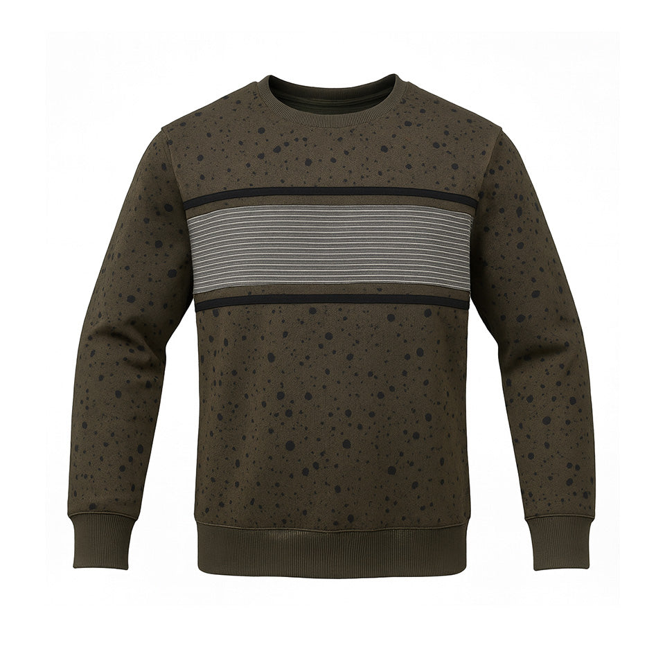 Forest Green Stripe Sweatshirt brings rugged outdoor style with modern detail. Features black splatter pattern and grey stripe panel across chest.